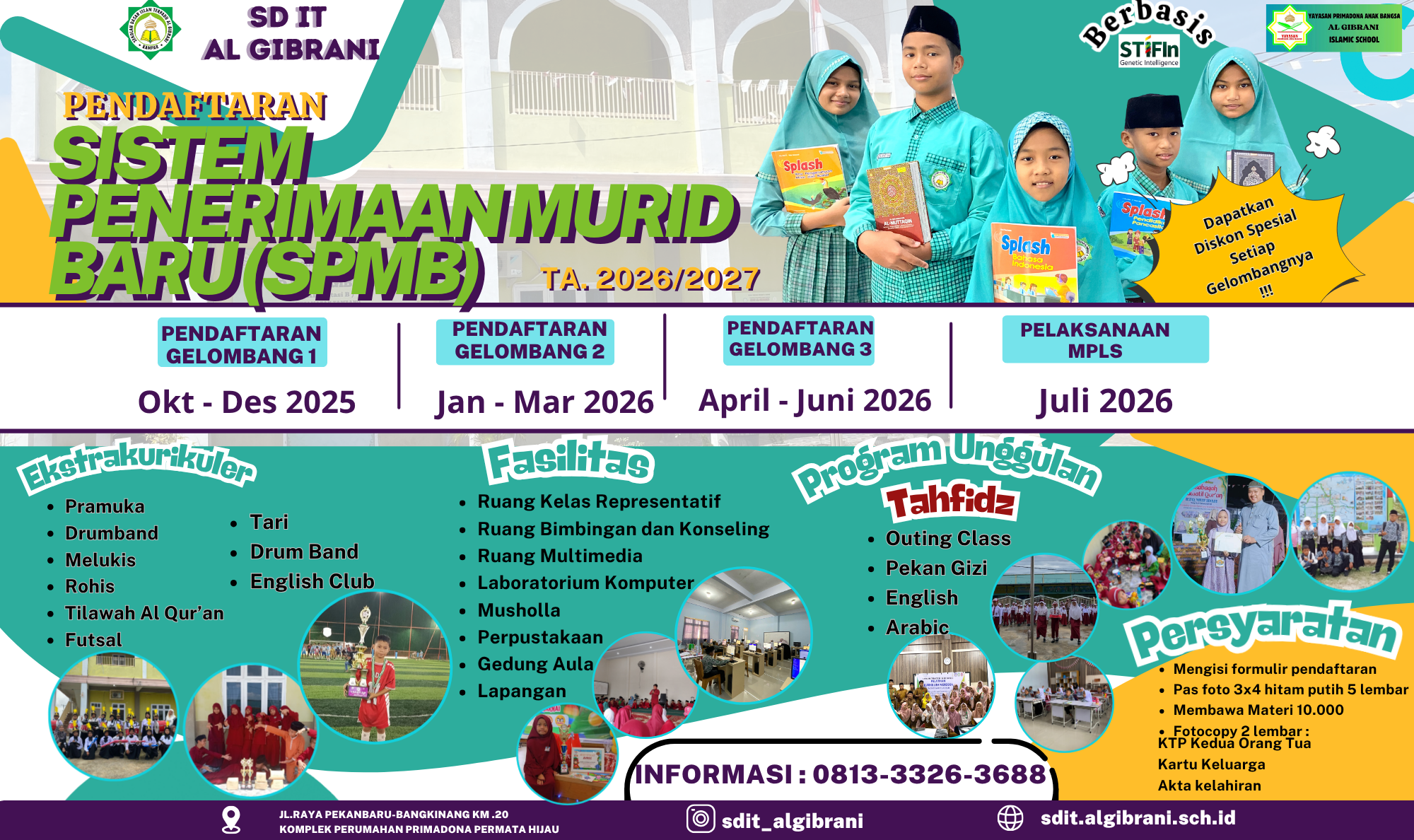 SD IT Al Gibrani kembali membuka Penerimaan Peserta Didik Baru (PPDB) untuk Tahun Ajaran 2026/2027. Kami mengundang ayah bunda untuk bersama menyiapkan generasi Qur’ani yang cerdas, berakhlak mulia, dan berwawasan luas melalui pendidikan terpadu yang menyeimbangkan ilmu, iman, dan amal.